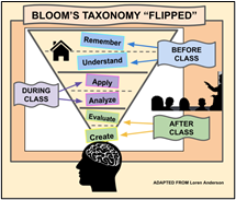 Though many claim to have a “flipped classroom” where students are assigned text reading and other supplemental assignments outside of class, Flipped Learning is an instructional approach where the teacher takes on the role of a facilitator. In this student-centered, flexible, interactive environment, the teacher uses direct instruction for small groups and individuals based on student creativity. Unlike the traditional classroom model of Bloom’s Taxonomy, Flipped Learning addresses the higher cognitive skills (applying and analyzing) in the classroom setting whereas the lower levels (remembering and understanding) are completed at home.