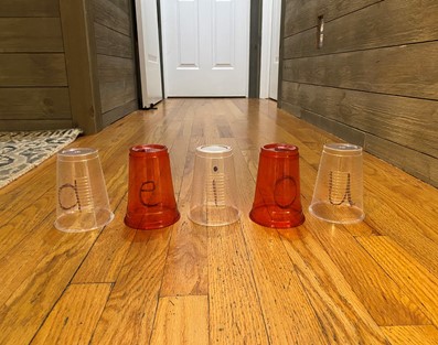 - Line up all 5 vowel cups at the starting line.
